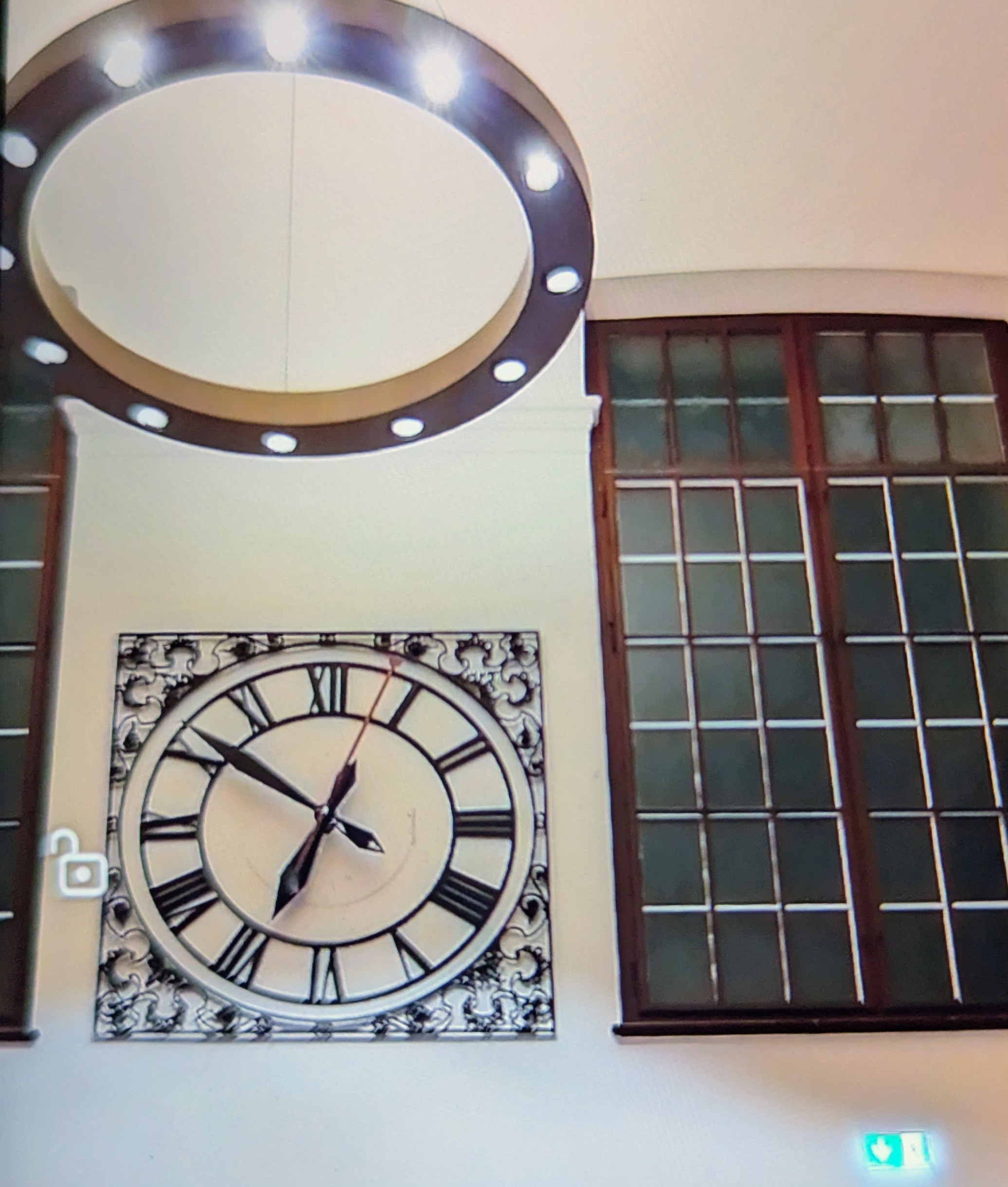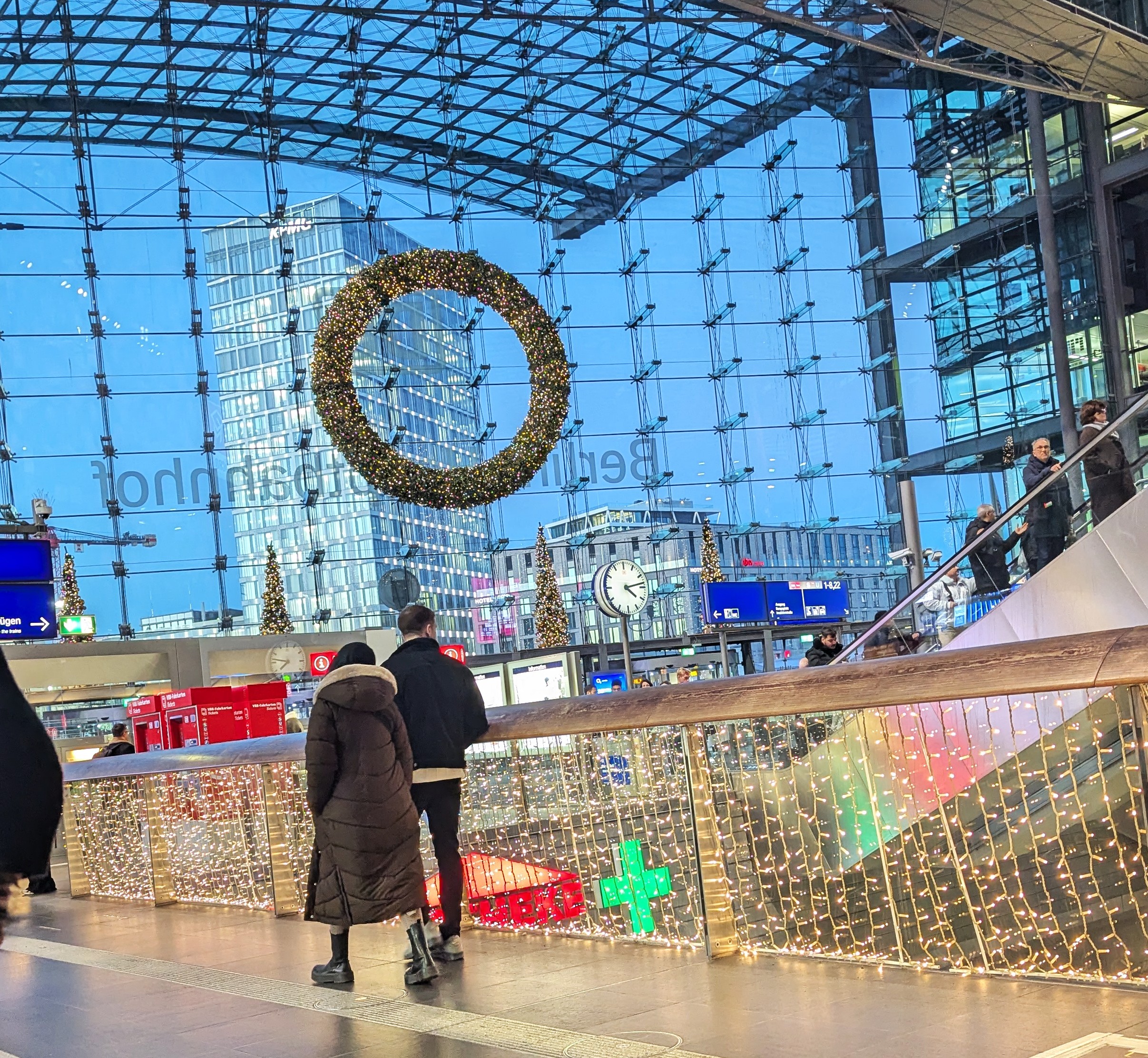 Auf dem Platz fällt tatsächlich der Blick auf die rekonstruierte ikonische Uhr aus den 1920er Jahren, deren Original auch filmisch präsent geblieben ist. Auf der aktuellen Suche nach einem Lokal bleibt sie die einzige öffentliche Zeitanzeige. Wenn es auf Pünktlichkeit angekommen wäre, hätte ich mein Smartphone aus der Tasche ziehen müssen. Nur auf den Bahnsteigen gab es sie noch – Bahnsteiguhren. Doch schon auf dem Weg aus der S-Bahn-Katakombe zur Straßenbahn fehlten genaue Zeitanzeigen. Nun war der Hauptbahnhof nicht mehr weit. Hinter seiner gläsernen Portalfassade hing ein großer leerer Kranz. Der dort saisonal vertikal platzierte Adventskranz hatte nicht einmal mehr Kerzen und verdichtete den Eindruck, dass uns hier eine Zeit ohne Zeitmessung begegnet. Walter Benjamin hatte in den „geschichtsphilosophischen Thesen“ erwähnt, dass die Revolutionäre in Paris unabhängig voneinander auf die Zeiger verschiedener Turmuhren geschossen hätten, was die Ankunft einer neuen Zeit manifestiert habe. Marclays Film könnte so ein ikonoklastischer Aspekt innewohnen. Er wäre damit auch ein Abgesang auf die analoge Zeitanzeige, denn heute ersetzen kleinste elektronische Bauteile mit Zeitfunktion in allen Devices physische Uhren. Displays, mit denen elektronische Geräte, Verkehrsmittel und Haushaltsgeräte ausgestattet sind, können jede Information anzeigen. Zeit wird damit zum inhärenten Bestandteil, die alle Geräte, die damit auch ihre Nutzer vernetzen und in ein holistisches System einbinden. Die episodische Lokalzeit, die das Kino nicht zuletzt durch die Klappen schon beim Dreh regierte, ist im Niedergang gegriffen, womit The Clock ihr Abgesang wäre.